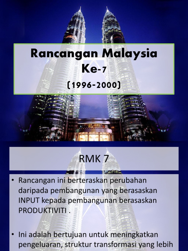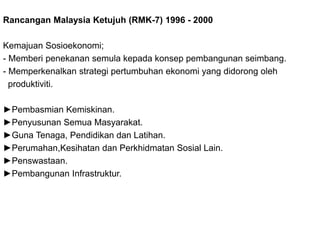 Tempoh separuh pertama RRJP2 dari beberapa segi merupakan satu jangkamasa penting apabila negara telah. Rancangan Malaysia Pertama RMK-1 ialah rancangan pembangunan ekonomi yang pertama dilaksanakan membabitkan seluruh Malaysia termasuk. RANCANGANMALAYSIAKE-71996-2000Matlamat Rancangan Malaysia ke-7 Mempercepat peningkatan produktiviti dan kecekapan terutamanya melalui inisiatif sektor swasta Meningkatkan pertumbuhan potensi keluaran peraliham struktur dan pembangunan seimbangMeningkatkan pertumbuhan potensi keluaran peraliham struktur dan pembangunan.