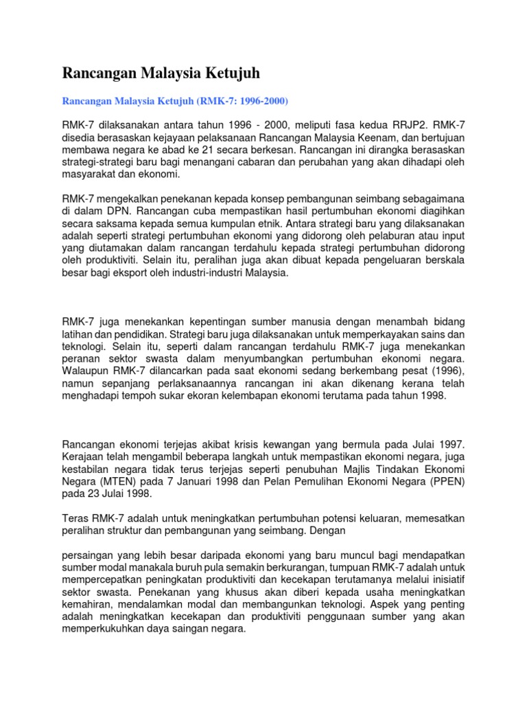 . 26 rows Rancangan Malaysia Ketujuh RMKe-7 1996-2000. The Seventh Malaysia Plan retains and reemphasizes the concept of balanced development first introduced in 1991 as a major feature of the NDP. Utama Bantuan Untuk B40 OKU PKS Wanita Dan Bumiputera.